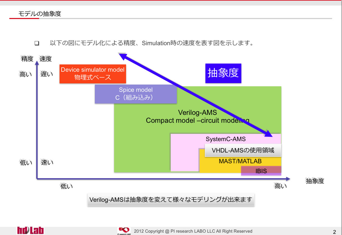 本来Verilog-AMSよりもVHDL-AMSの方が表現力があるはずですが、普及例のVDA FAT-AK30を見ますとほとんどがSystem系の抽象度で収まっていますので、上記のように表しています。Veriog-AMSはCMC(Compact model Concil)のモデリングの標準言語であると同時に回路設計で各社使用例が多くあるので上記のように広いエリアになっています。