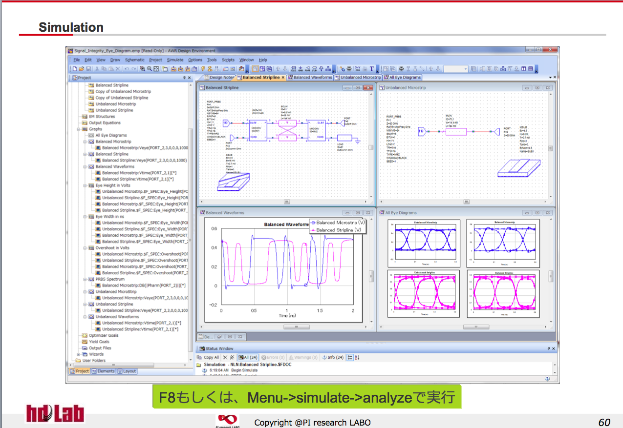 近年、USB3.0やHDMI等民生機器にもGHZオーダの伝送をされ始めました。 実際はかなり前から一部の一般家庭には、今で言うFLETS光が入っており、これには 14G帯域の電気信号を取り扱うTIA(Trans impedance amp)、それを処理するICが搭載 された装置:V-ONU(Video Optical Network Unit)が導入されていました。 ようやく、映像信号をデジタルで転送ということで、HDMIが取りざたされてますが、映像 伝送ではこちらの方が遥かに昔で、高度な技術が詰まっています。 それは、さておき、高速伝送をいろいろとSimulationする機会が多いと思いますが、基本的 な事を理解してないと、Simulationで大きく失敗してしまいます。 たいていのソフトウエアでは、実測とぴったし合います!なんて言ってるのもありますが 条件を実測に合わせてる!と言ったのものがほとんどでかなりいい加減なものです。 詳細はお問い合わせいただければ、コンサルティングを含めて可能ですので、是非是非 お問い合わせください。