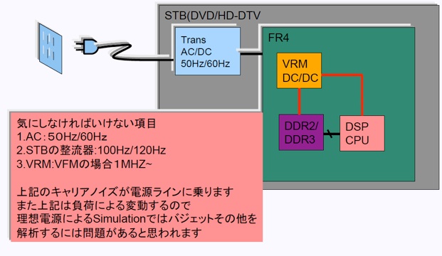 半導体のノイズがのってる様子がわかるかと思います。 実際は、あまりEYE openingに関係ないと見えそうですが、BER(Bit error Rate)解析をすると大きく影響が出てるのが分かります。 宣伝になりますが、詳細はお問い合わせください。 高速伝送の解析についてですが、正確なSimulationをするとEMI/EMCも同時に解析出来ます。弊社では以下のように考えており、従来のTx送信-Rx受信だけでなく基板上の電源を含めて解析の提案をします。そうすることにより、全体に与えるエネルギーと消費されるエネルギーと放射されるエネルギーの間にはエネルギー保存則が成立し矛盾のないSimulationが出来ます。当然基板全体の解析は、LSI/ICの内部まで情報が必要ですが再モデリングで解決しています。