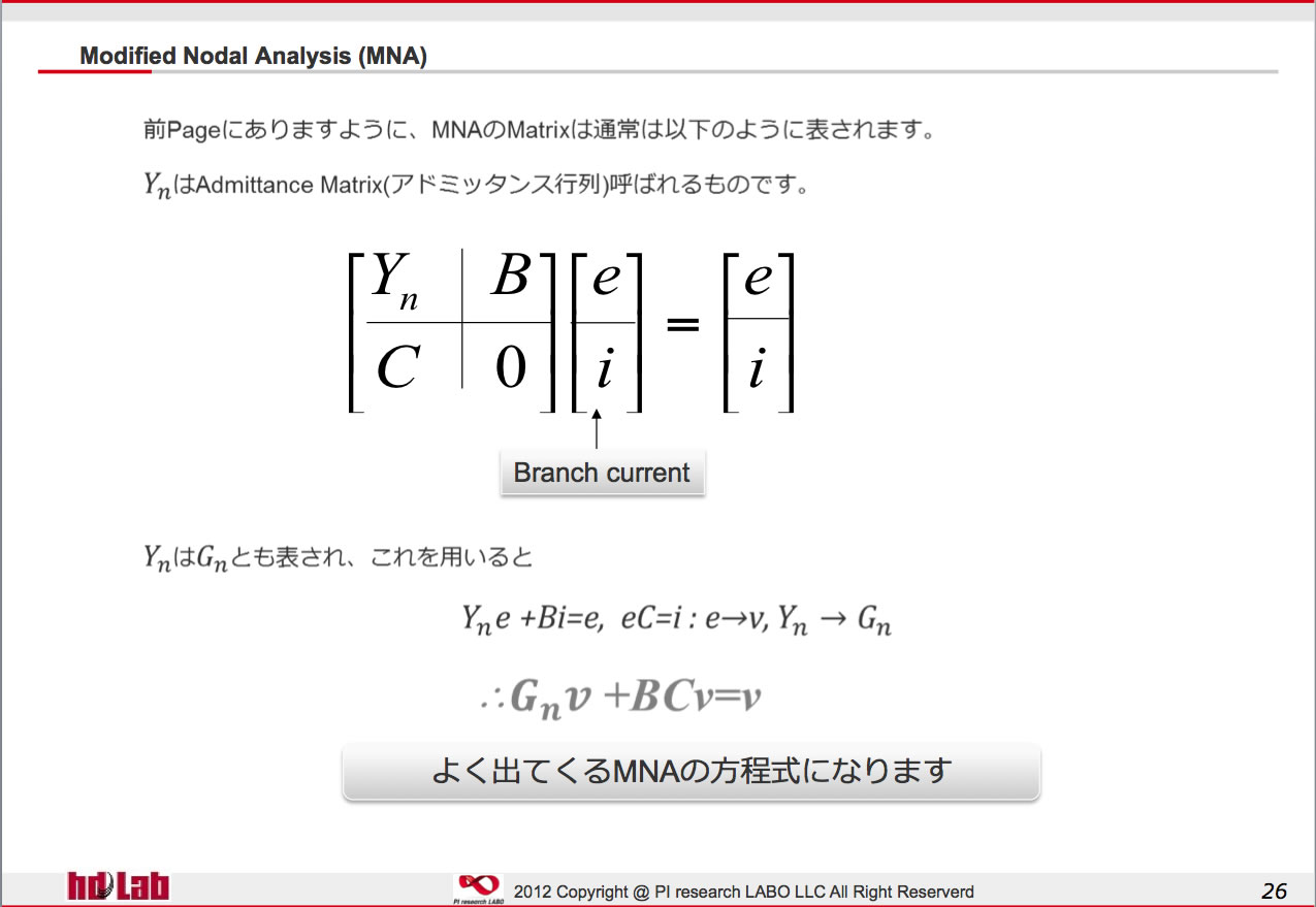 SPECTRE*/NEXXIM等のBerkeley Spiceを起源に持たないSpiceでは、KCLを使用するこSpiceもあります。(以下HDLAB講座:2012年Spice Simulation & modeling講座より)