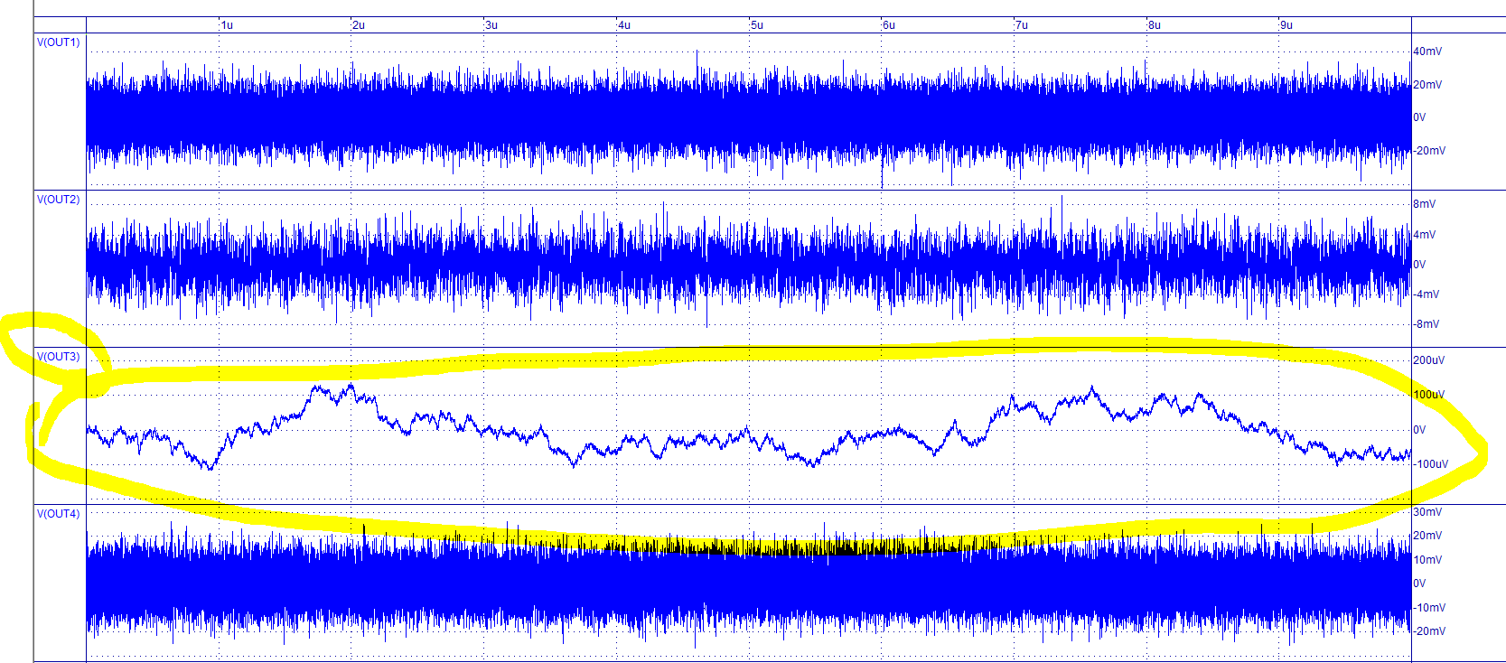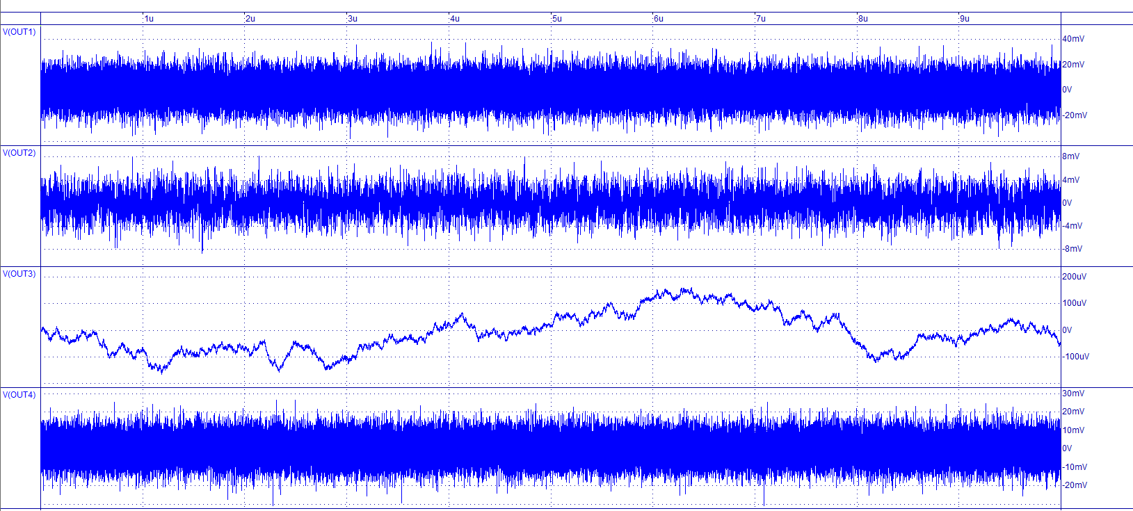 - .Trace Tran V(OUT1) V(OUT2) V(OUT3) V(OUT4) Min=-3.2351012e-003 Max=4.0832489e-003