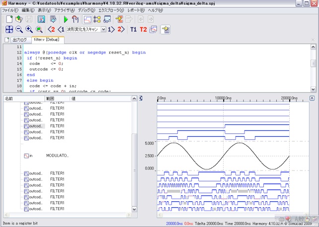 そして、6次のCT(連続時間)のΔΣのVerilog-AMSのSimulationをしてみました。 使用ツールは、LynguentのModlyngというModelingで紹介しているツールからVerilog-AMS を出力して、Harmony-AMSにてシミュレーションしてみました。