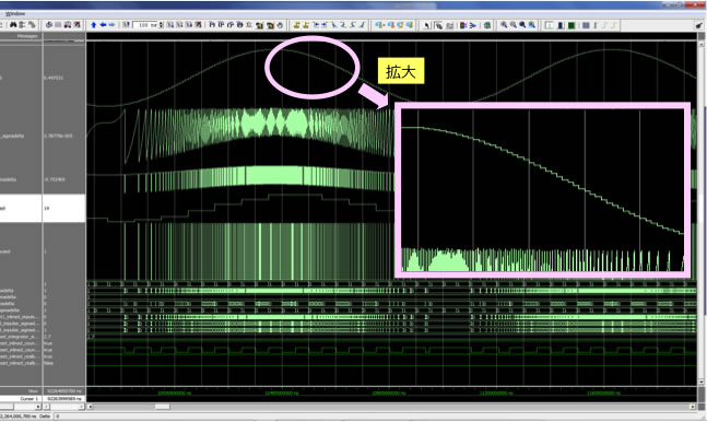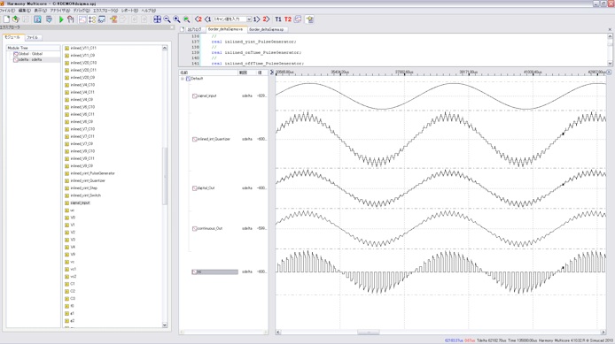 real number の取り扱いはVHDLはかなり前から使われていていましたが、最近Cadenceがいろいろと宣伝されてるみたいですね。どういうアプリで使えるのかが重要で、どういう機能が良いですよでは、使いようがないです。以下は同じく得意なΔΣADCのSim波形です。sin波形が離散値として表現されてるのが拡大図で分かると思います。これはデジタル系のSimulatorでながせるので通常のAMSのSimulatrの約10-100倍ぐらいの速度UPが期待出来ます。こういった常に先進的な機能の紹介も講座で常に取り入れて実例を紹介しております。