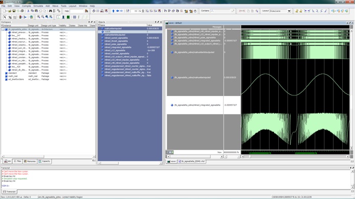 以下は、Dolphin IntegarationのSMASHとMentorのQuestasimの同じVHDLで書かれた1bit delta-sigma ADCのSimulation結果です。EDMSというLibrariesを使用してますのでデジタルシミュレータでで流すことができます。