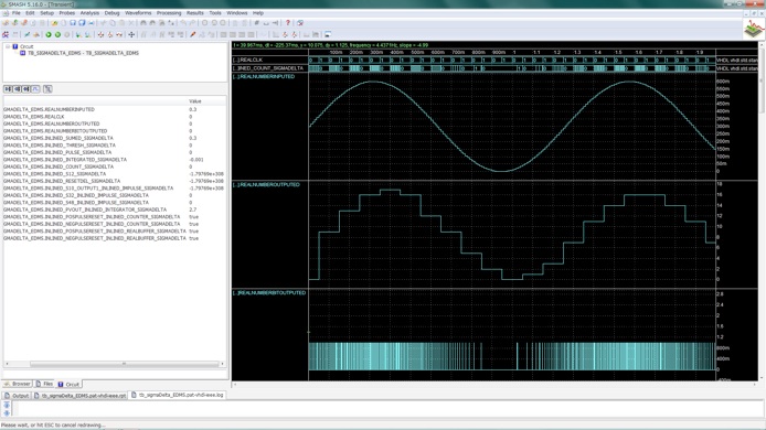 以下は、Dolphin IntegarationのSMASHとMentorのQuestasimの同じVHDLで書かれた1bit delta-sigma ADCのSimulation結果です。 EDMSというLibrariesを使用してますのでデジタルシミュレータでで流すことができます。 SMASHのVHDLのコンパイラかなり優秀で、Questasimの10倍以上早いです。