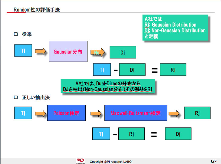 NoiseとJitterは切っても切れない関係である事は、設計者の皆様には周知の事実でありますが、世の中の常識は非常識という格言があるぐらい、測定アルゴリズムが非公開な物はありません。A社の測定器で計ったJitterとB社の測定器で計ったJitterが違う、ごく当たり前ですが、真相はA社がJitter分離のPatentを持ってるため同じアルゴリズムが使用出来ないのです。つまりA,B,C社の測定器メーカのJitter測定は全て違うと言うことになります。