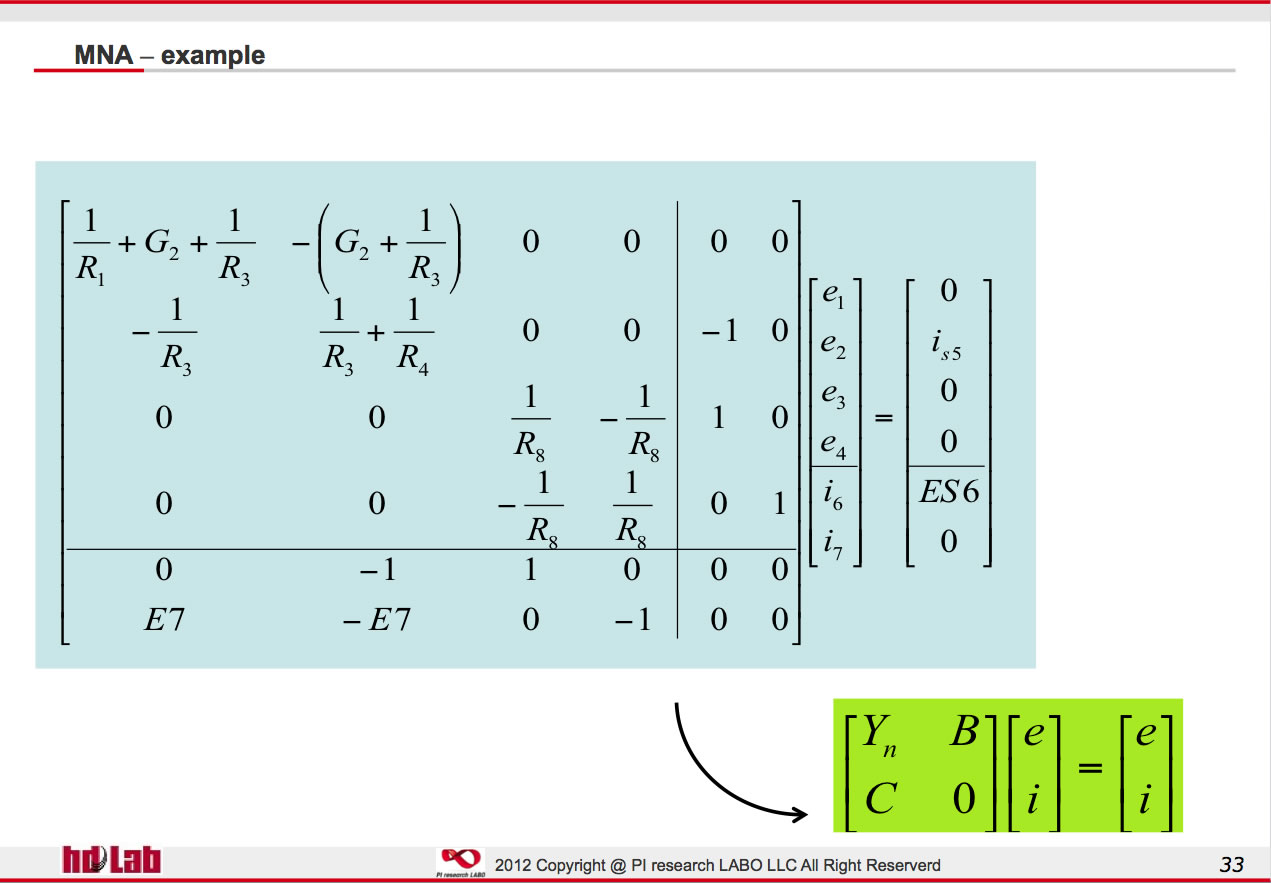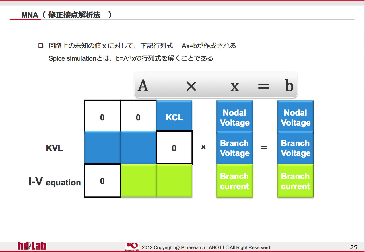 SPECTRE*/NEXXIM等のBerkeley Spiceを起源に持たないSpiceでは、KCLを使用するこSpiceもあります。(以下HDLAB講座:2012年Spice Simulation & modeling講座より)